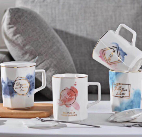 歐式小清新水墨風(fēng)創(chuàng)意陶瓷馬克杯子帶蓋勺情侶咖啡杯簡(jiǎn)約字母禮品